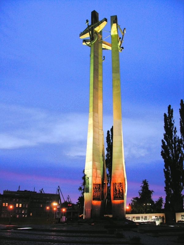 Pomnik Poległych Stoczniowców stoi na Placu Solidarności w Gdańsku, w sąsiedztwie Bramy nr 2 Stoczni Gdańskiej. Został odsłonięty w 1980 r. i upamiętnia pracowników stoczni, którzy zginęli podczas strajków w grudniu 1970 r. Pomnik składa się z trzech betonowych krzyży o wysokości 43 metrów, ustawionych w stosunku do siebie tak, że tworzą trójkąt. Na każdym z krzyży zawieszona jest kotwica, a w dolnych i częściach umieszczono tablice z płaskorzeźbami przedstawiającymi pracę stoczniowców oraz fragmentem wiersza Czesława Miłosza, „Który skrzywdziłeś”.