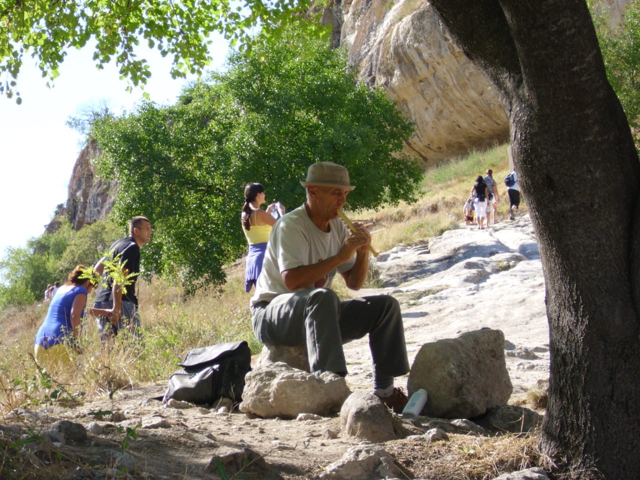 Ale czasu nie zmarnowaliśmy, wyczytaliśmy po drodze w moim niezawodnym przewodniku co jeszcze warto zobaczyć. Monastyr Uspieński i Czufut-Kale. Jednak najpierw wypadałoby coś zjeść – trafiliśmy do uroczej tatarskiej(?) restauracji, porośniętej winoroślą… Bardzo sympatyczne miejsce, dobre jedzenie i kolejne znajomości. Zagadał do nas Rosjanin, który siedział dwa stoliki dalej. Zainteresował się skąd jesteśmy, polecił zwiedzenie monastyru mówiąc na koniec przekornie: „kto nie zobaczy klasztoru ten nie Polak” – wie facet jak Polaków zmobilizować! Co jednak najciekawsze: jego żona (obecna oczywiście w restauracji i radośnie do nas machająca gdy zauważyła, że o niej mowa) podobno zdobyła kilka medali na igrzyskach olimpijskich lata temu. Niestety nie pamiętam w jakiej dyscyplinie… Zjedliśmy, wypiliśmy – można było ruszać dalej.